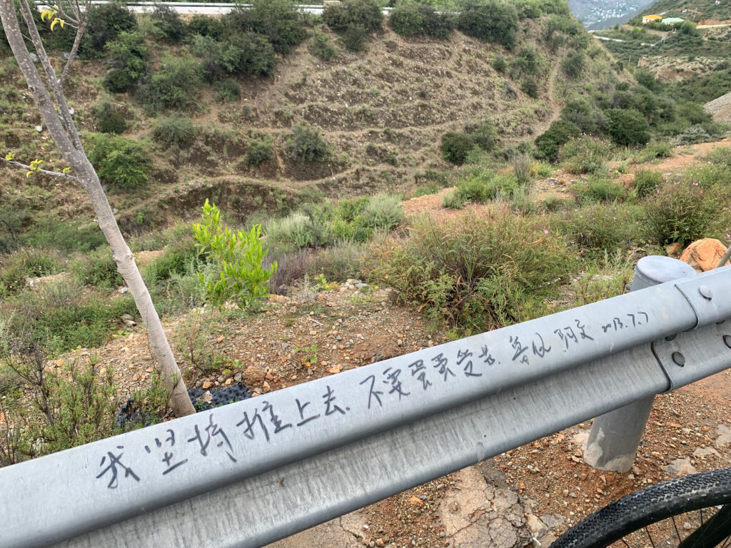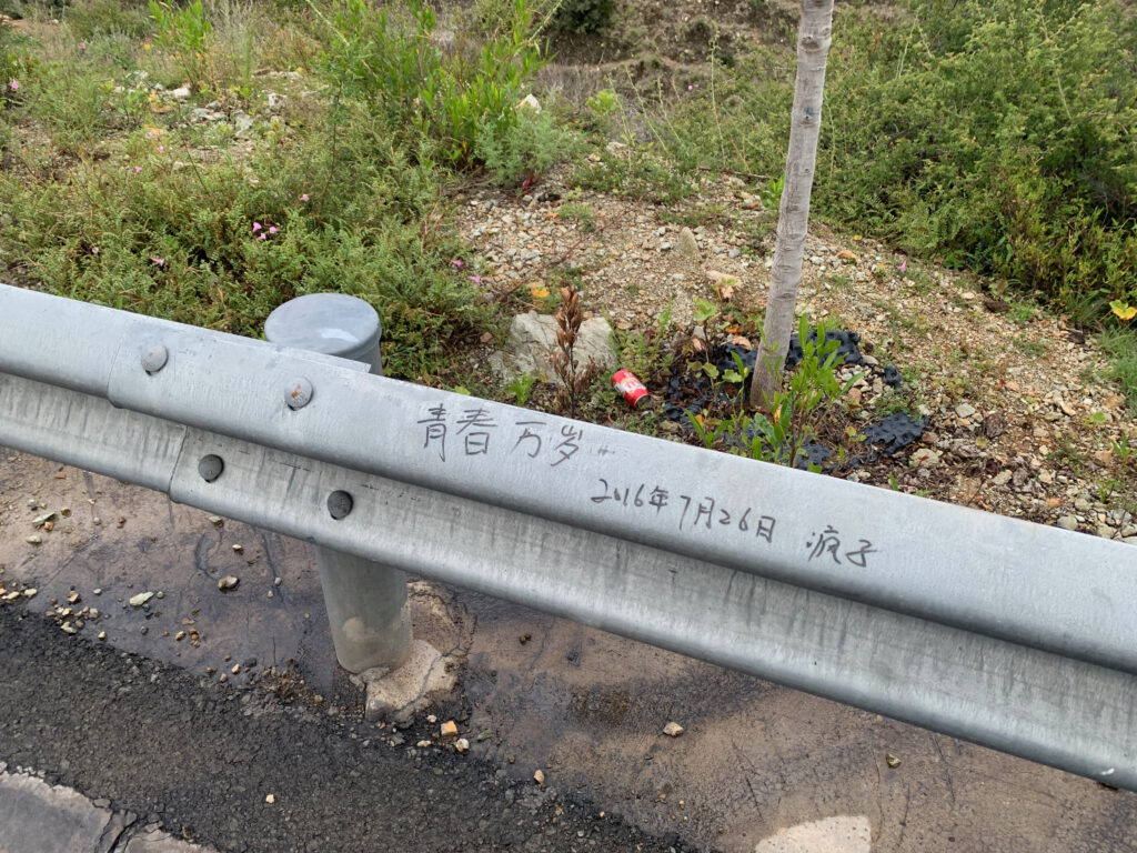从观景台出发继续爬坡,看到护栏上的山古时期的留言,队友们来围过来饶有兴趣地看。我的内心彷佛被什么东西击中了。