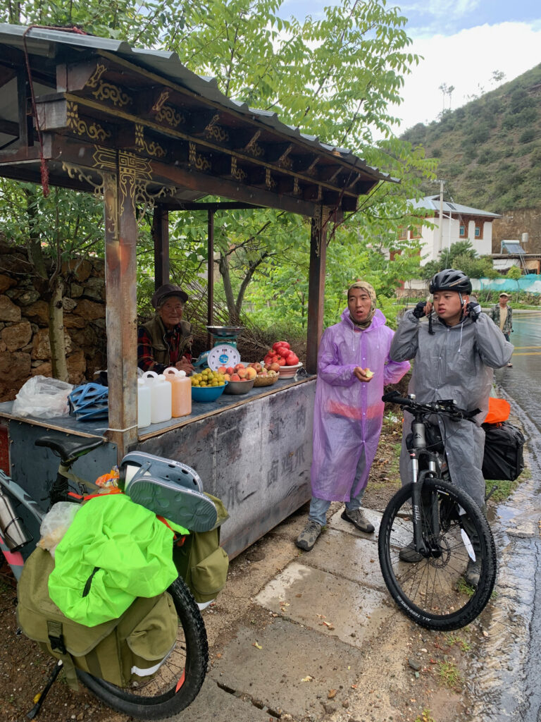 再往后,还是看不到白马雪山,在这雨季一直被云笼罩着。遇到一阵小雨,我在前面看到一个慈祥的藏族老太太在一个简陋的水果摊前一直对我笑,我就跑过去躲雨。老太太慈祥地笑着说请我吃水果,可是我觉得这样不太好,就买了一些,等队友到了后招呼他们一起吃,