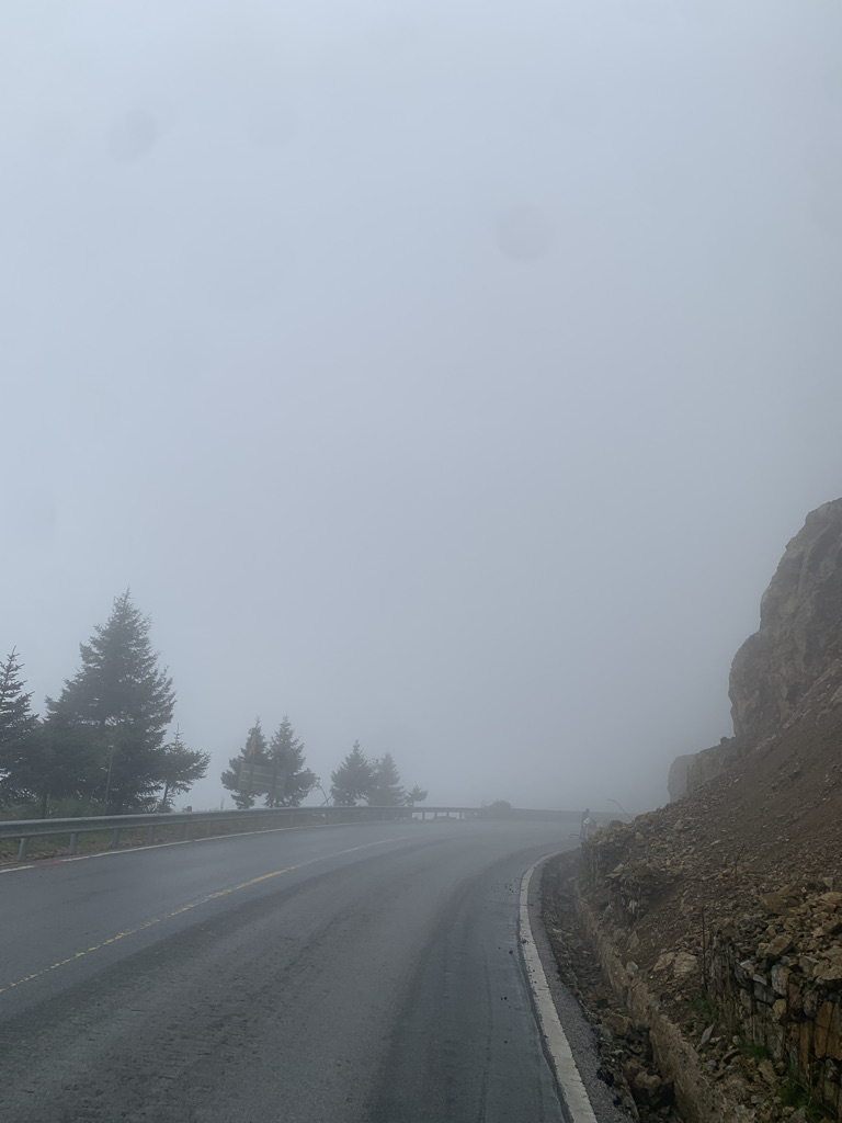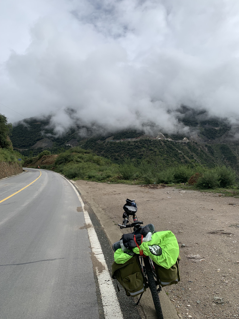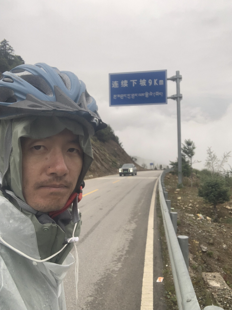 前方大雾迷茫,能见度非常低,而且还挺冷。我稍作休息,穿上了抓绒卫衣,马甲,冲锋衣,雨衣,又把两个保暖护膝都穿上,以防身体受风寒,简直武装到了牙齿。这也体现了我与上一次骑行318相比,成熟了许多,考虑问题更周到了。