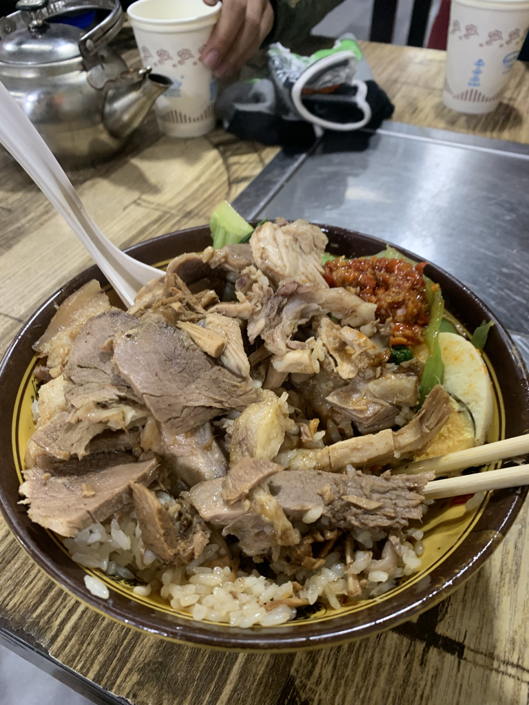下坡快到德钦县城时,我停下来等后面的阿涛,他那个装备太单薄了。小沐找到了吃饭的地方,发来位置。片刻之后,阿涛缓缓赶上。我们一起下坡到县城找到了正在吃猪脚饭的小沐。