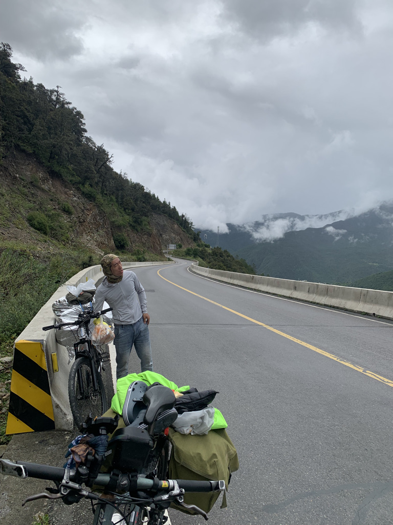 从海拔4000米处出发后,天色渐黑,而雾气越来越大,还伴随小雨,白马雪山垭口始终不见踪影。我们穿上雨衣骑行,一会就出汗受不了。