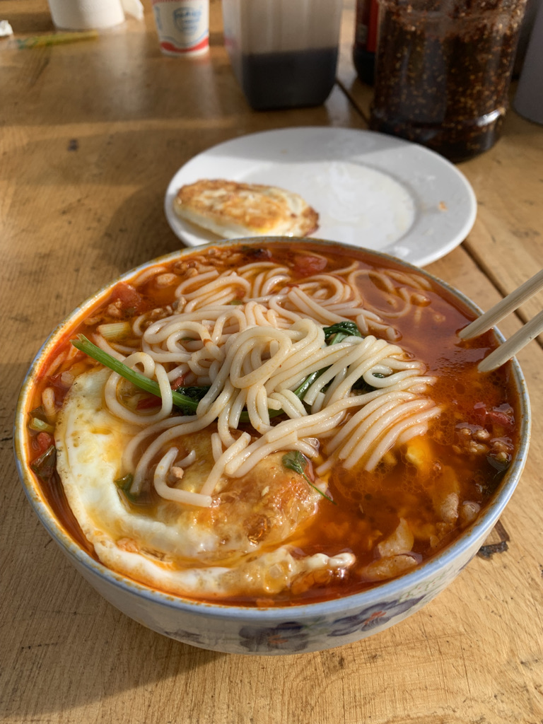 第二天的早餐依然是美味米线,顺便让老板帮我们烙一块大饼在路上点心,我又多点了两个鸡蛋补充营养。