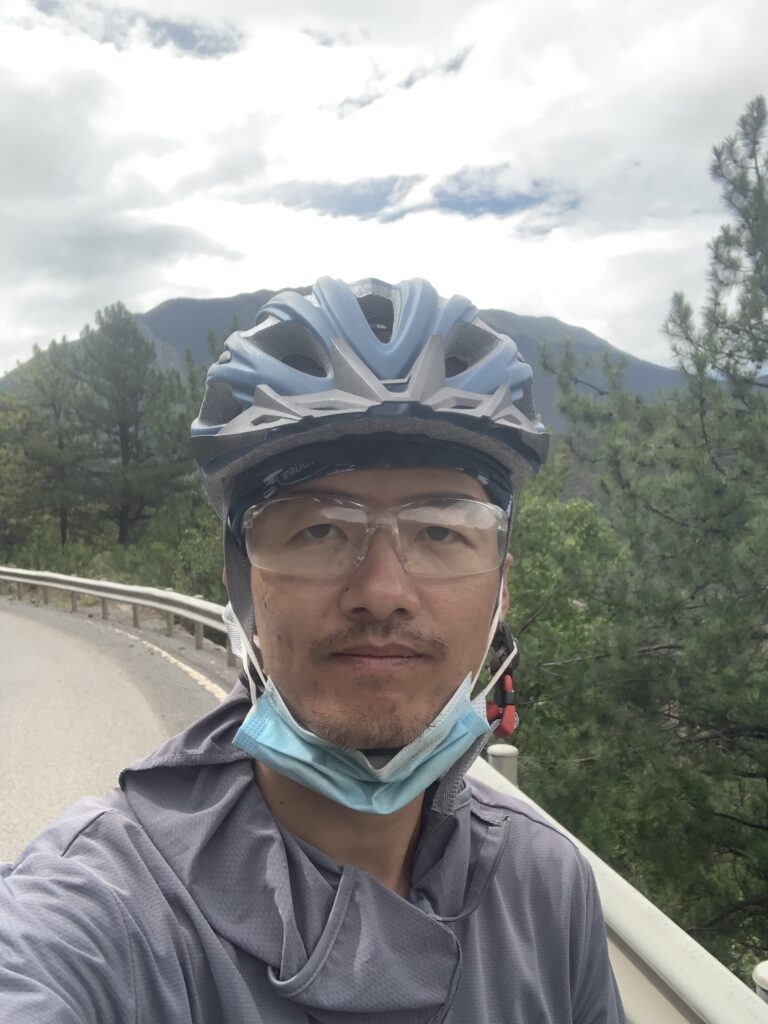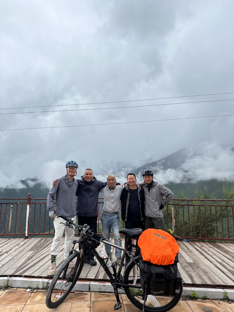 大雾笼罩,越爬坡越明显,并无什么风景可言。在一处简易的观景台遇到两位自驾的车友非常激动地与我们聊天。两位车友平时喜欢骑行,却因为要谋生,没有什么机会骑行。这次公司到香格里拉团建,他俩就请了假租车往滇西北深处自驾游玩。