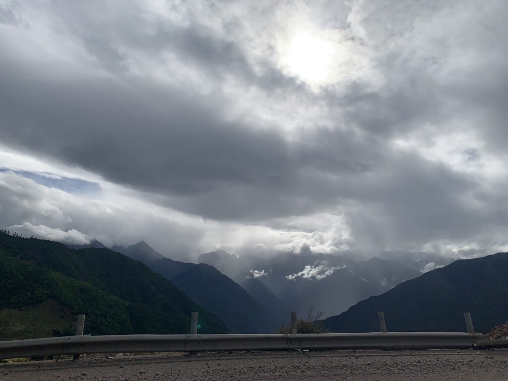 在半路遇到阿涛与一位摩托车友停在路边抽烟,非常抽象。我打了声招呼就走了,没有停下。更抽象的是,随着海拔的降低,能见度居然越来越低,雾简直大的离谱。而小沐居然在这大雾中,抓怕到了他心心念的梅里雪山。